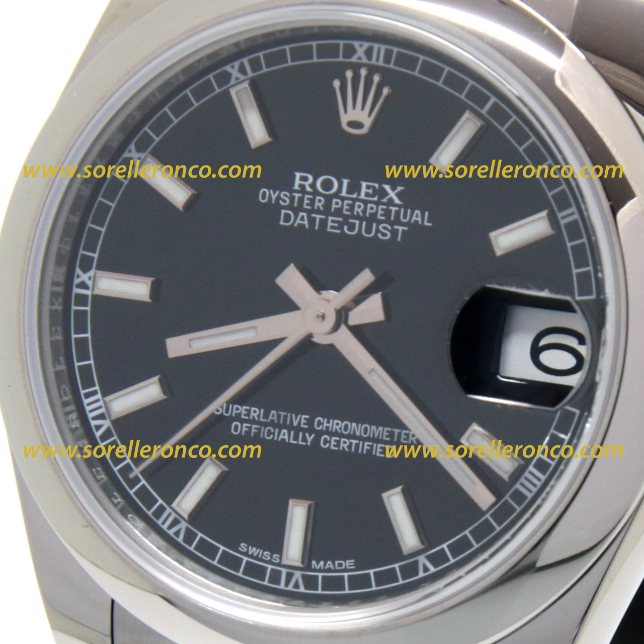 Orologio Rolex Datejust con cassa in acciaio da 31mm e ghiera liscia. Il quadrante nero con indici e datario ad ore 3.