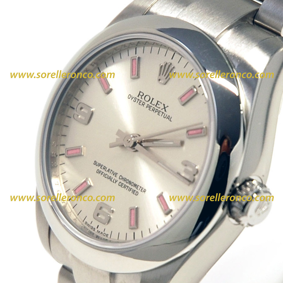 L'orologio Rolex Oyster Perpetual con cassa in acciaio da 31mm monta un quadrante silver con indici rosa ed il classico bracciale Oyster in acciaio e 3 maglie.