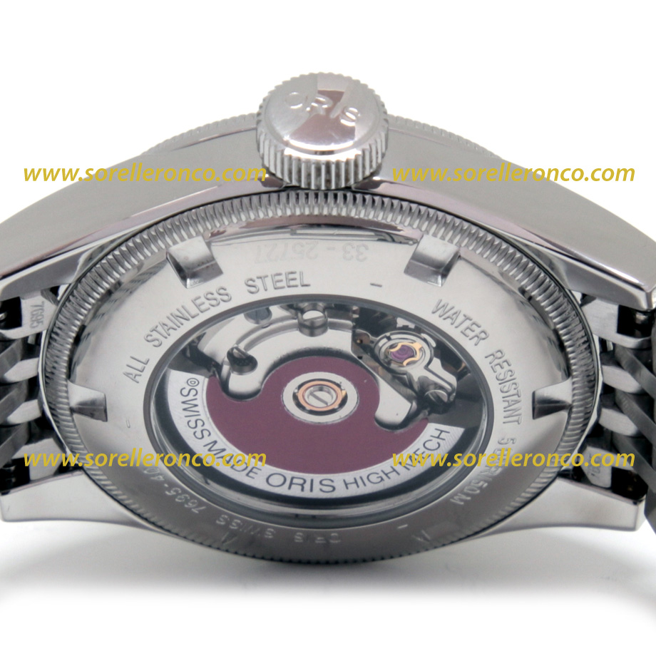 Movimento Automatico calibro Oris 594. Riserva di carica di 38 ore.