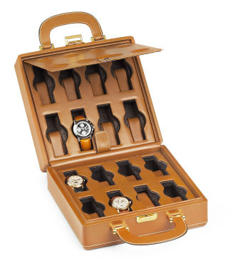 SCT041 REF: 16B Carrying case for 16 leather strap or bracelet watches. Fully leather covered outside. Leather and pure jacquard silk inside. Gold plated clasp. |