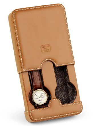 SCT032 REF: 2A Astuccio per 2 orologi con cinturino in pelle. Rivestito in pelle all’esterno, pura seta jacquard e pelle all’interno. |