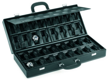 SCT043 REF: 32B Oversize Valigetta con maniglie per 32 orologi di grandi dimensioni (diametro cassa, corona inclusa, 56 mm) con cinturino rigido o in pelle. Rivestita in pelle all’esterno, pura seta jacquard e pelle all’interno. Chiusura color argento. |