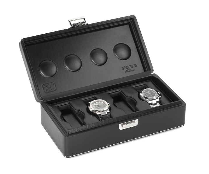 SCT034 REF: 4B Astuccio per riporre fino a 4 orologi con cinturino rigido o in pelle. Rivestito in pelle all’esterno, pura seta jacquard e pelle all’interno. Chiusura color argento. |