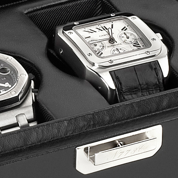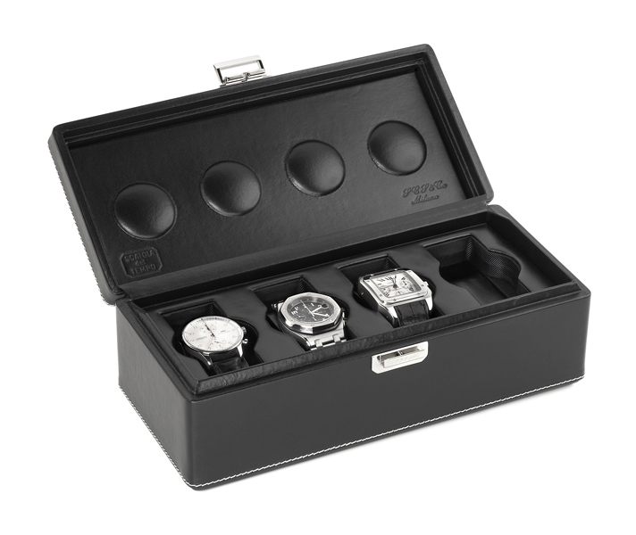 Astuccio per riporre fino a 4 orologi con cinturino rigido o in pelle. Rivestito in pelle all’esterno, pura seta jacquard e pelle all’interno. Chiusura color argento.