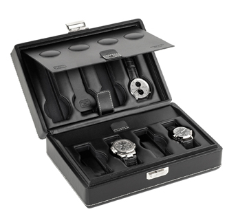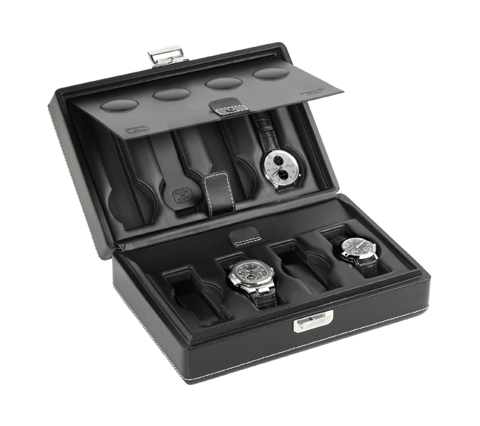 SCT035 REF: 4+4 Astuccio per 4 orologi con cinturino in pelle e 4 orologi con cinturino rigido. Rivestito in pelle all’esterno, pura seta jacquard e pelle all’interno. Chiusura color argento. |