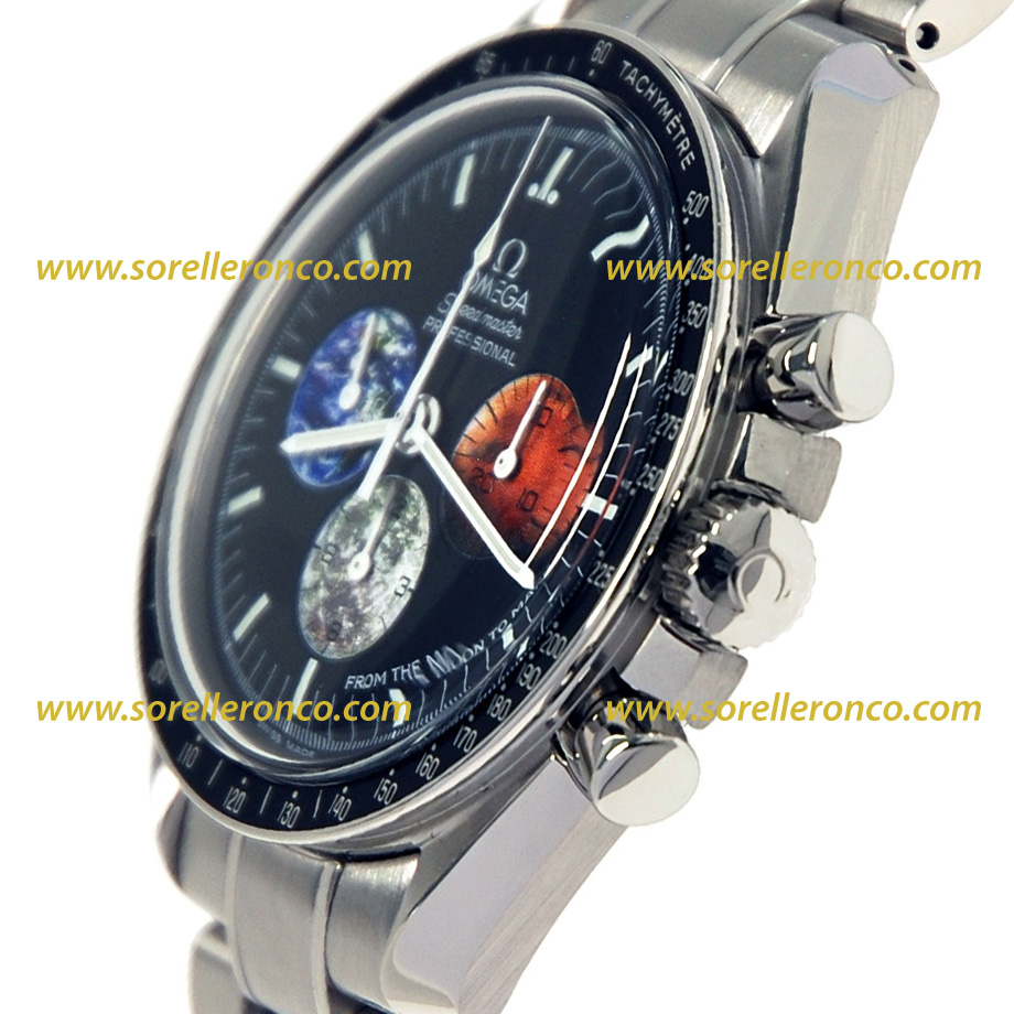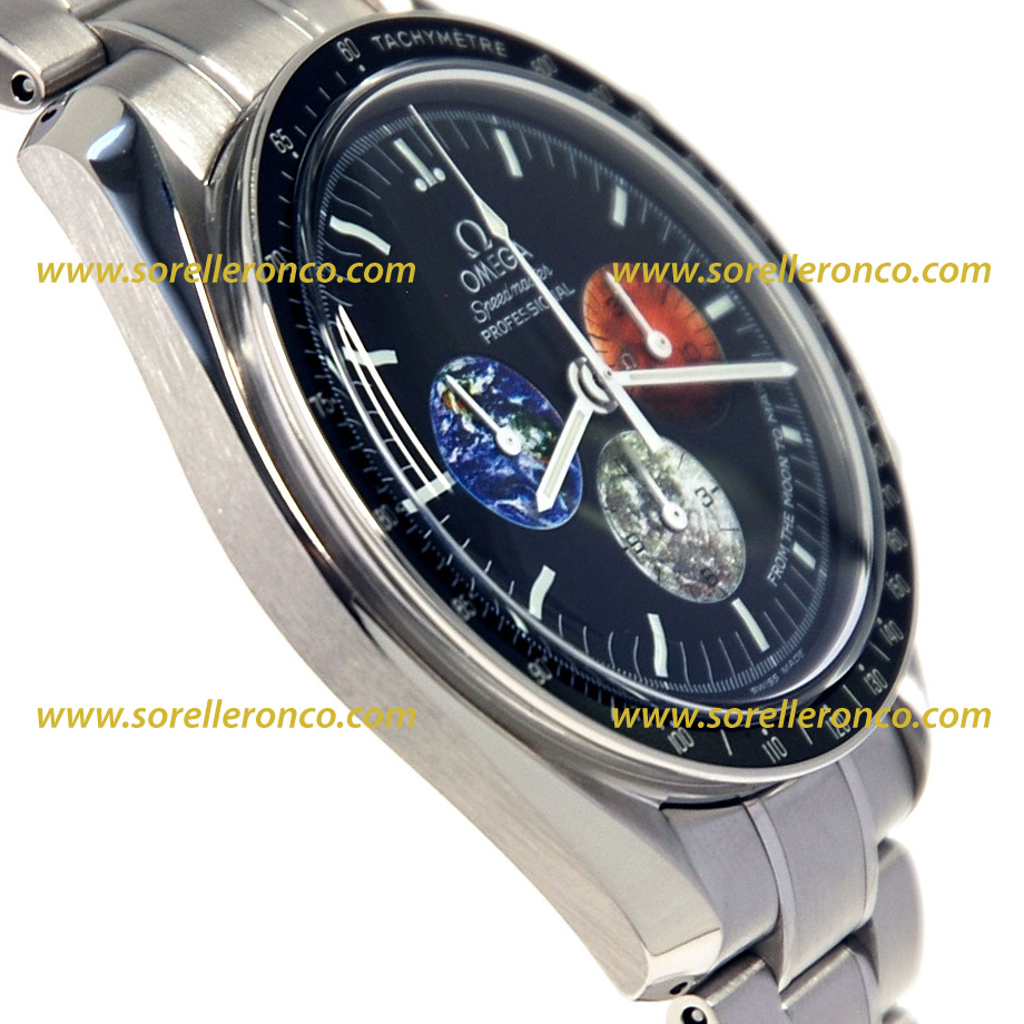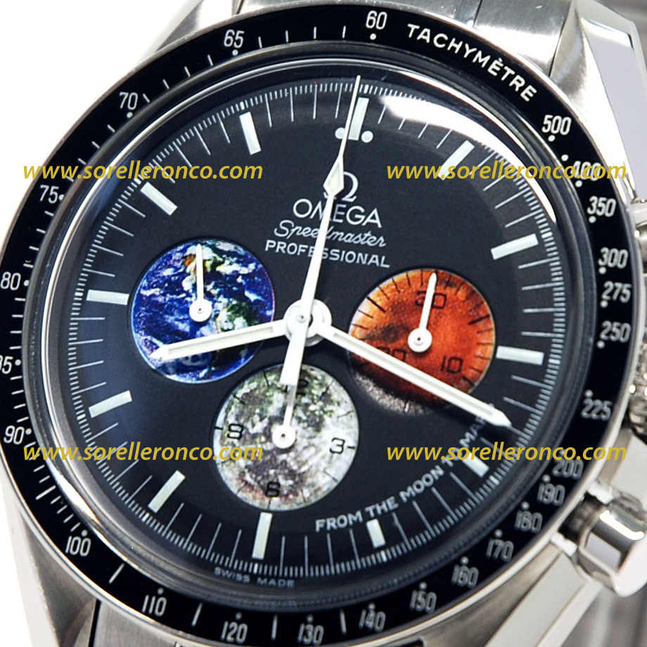 L'orologio Omega Speedmaster Professional from Moon to Mars è un cronografo a carica manuale che monta il famoso calibro 1861 di manifattura Omega. Il quadratne nero ospita 3 contatori che riproducono la Terra, la Luna e Marte.