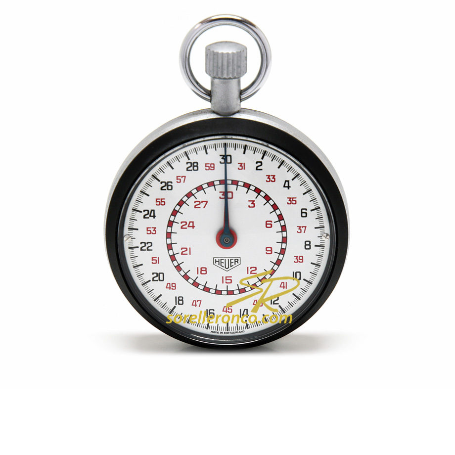 Cronometro meccanico Heuer 1/10 di secondo. Il quadrante bianco misura fino a 30 minuti. Quasto modello del 1973 era usato per gare di Rally.