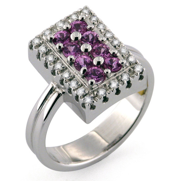 Anello Zaffiri Rosa ReCarlo. Anello in oro bianco 18 kt con zaffiri rosa e diamanti modello Re Carlo con incastonatura a pavè. Anello artigianale made in Italy Recarlo in vendita on line con prezzo scontato corredato da garanzia e certificato di autenticità presso la Gioielleria Sorelle Ronco di Vicenza.